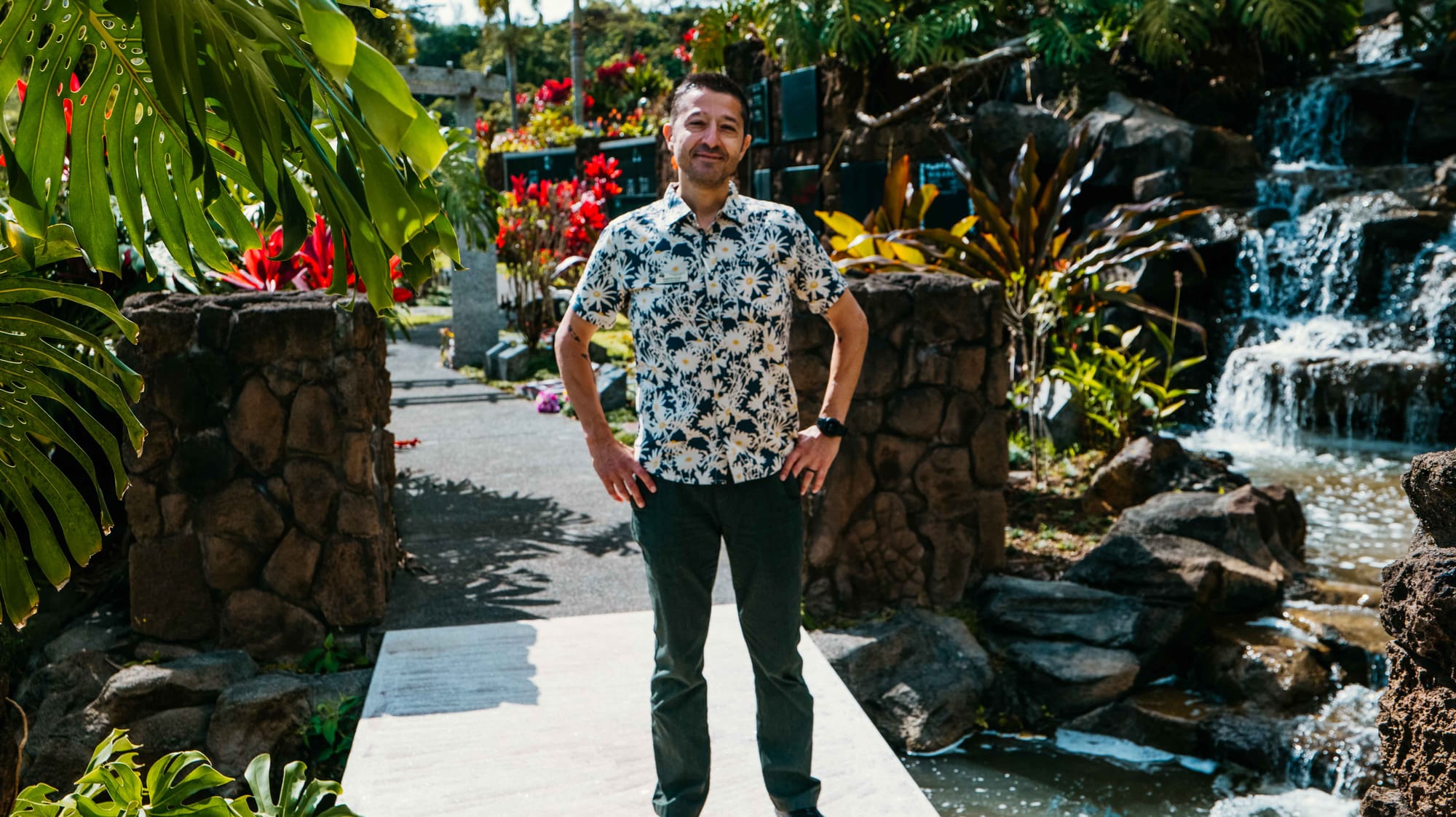 One of Huseyin's primary responsibilities is assisting families in locating the ideal grave plot within the Valley. The park is divided into multiple sections, each with its own distinct features. The latest and most significant development is the Ocean View Terrace, the last garden to be developed in the Valley of the Temples. This section offers breathtaking views of Kaneohe Bay and is designed around a stunning water feature, the largest of its kind on Oʻahu. This tranquil setting provides a serene backdrop for reflection and remembrance.