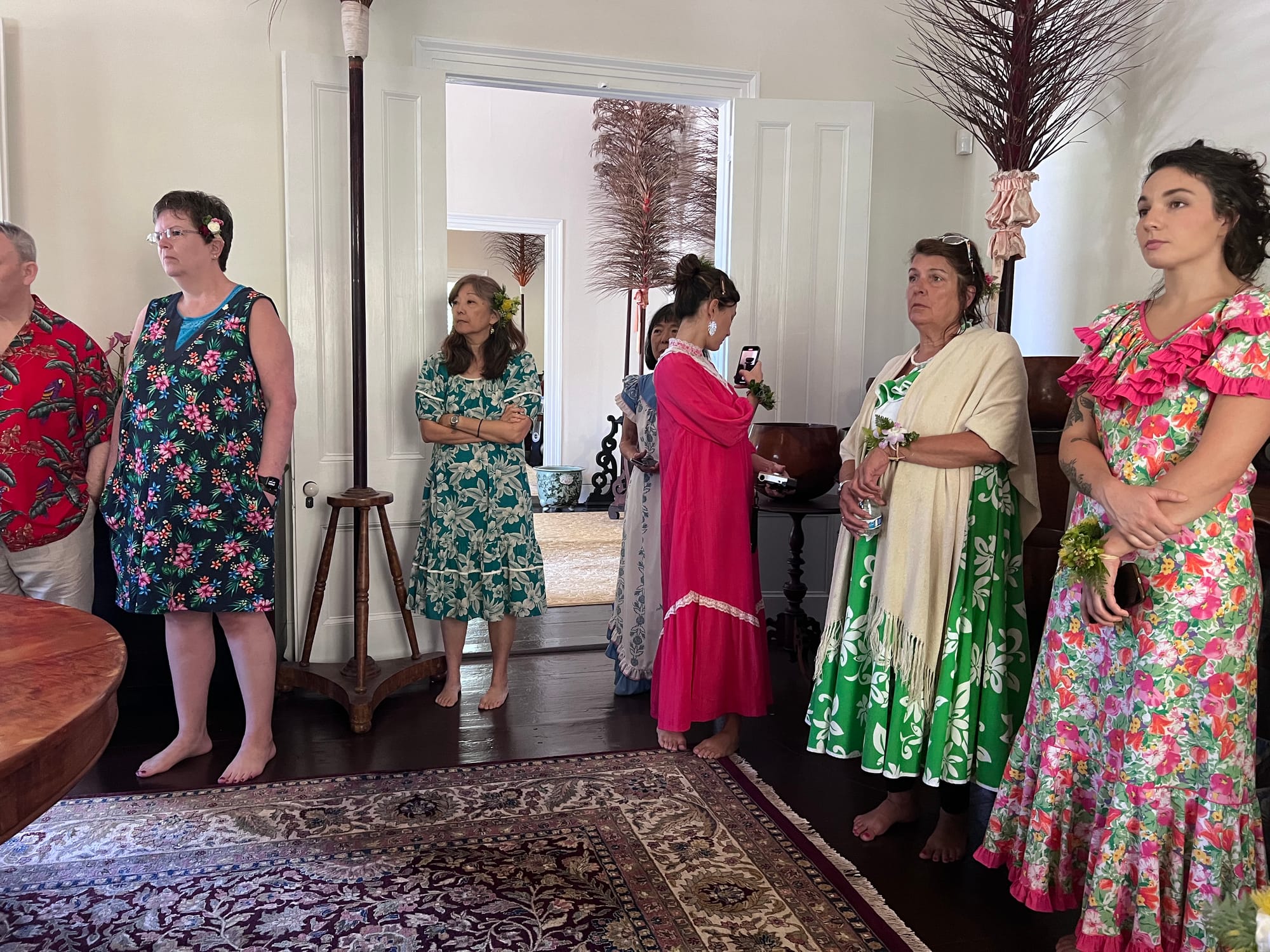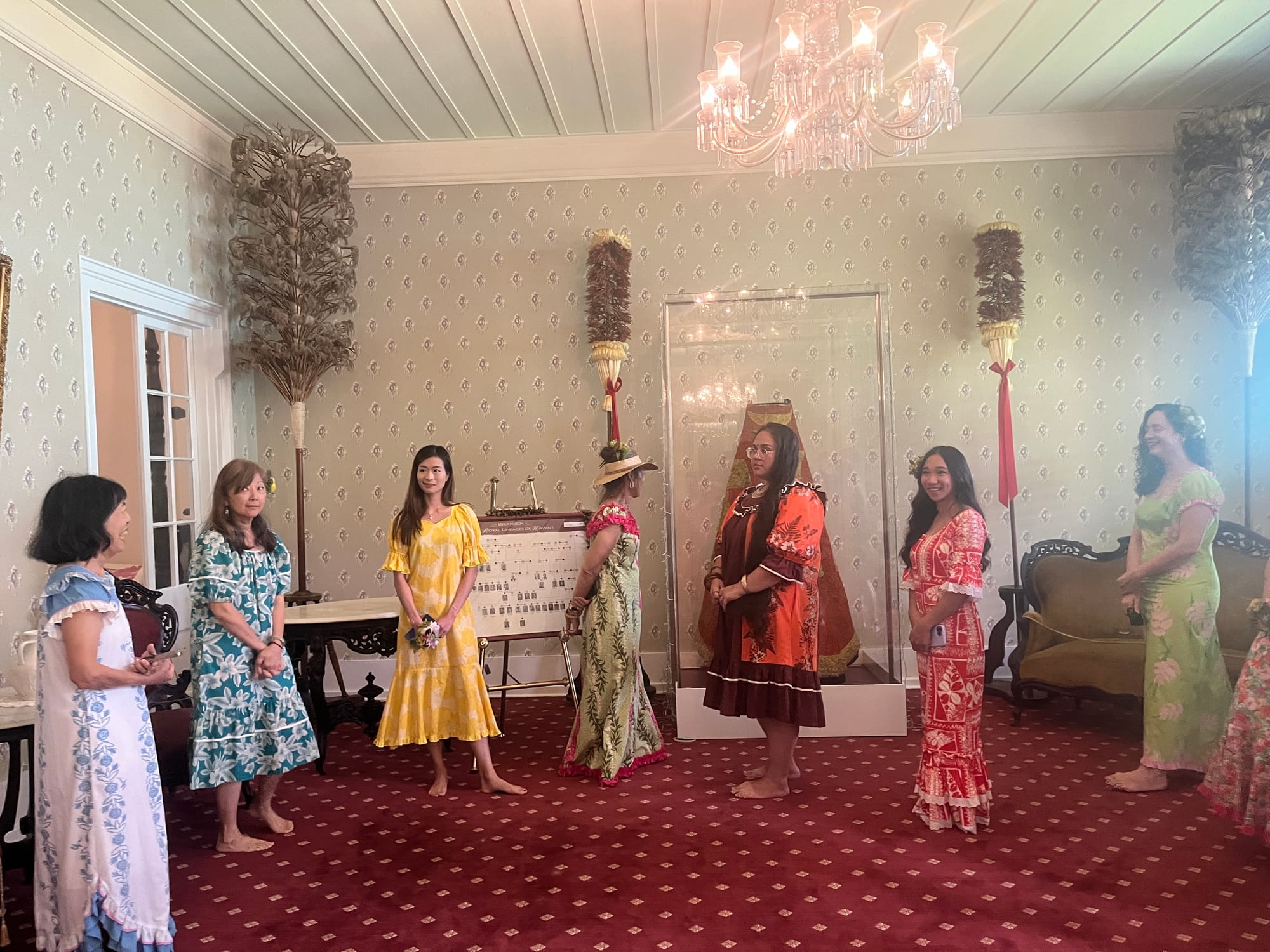After donning their chosen Mu'u mu'u dresses, the participants engaged in the art of lei making. With materials from the lush grounds of Queen Emma Palace, they crafted beautiful leis, a symbol of friendship, aloha, and connection to nature. This creative process not only honored Hawaiian traditions but also fostered a sense of collaboration and shared experience among the attendees.